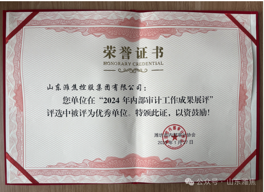 近日,濰坊市內部審計協會組織2024年全市內部審計工作成果展評,集團公司榮獲“2024年內部審計工作成果展評優 秀單位”稱號。