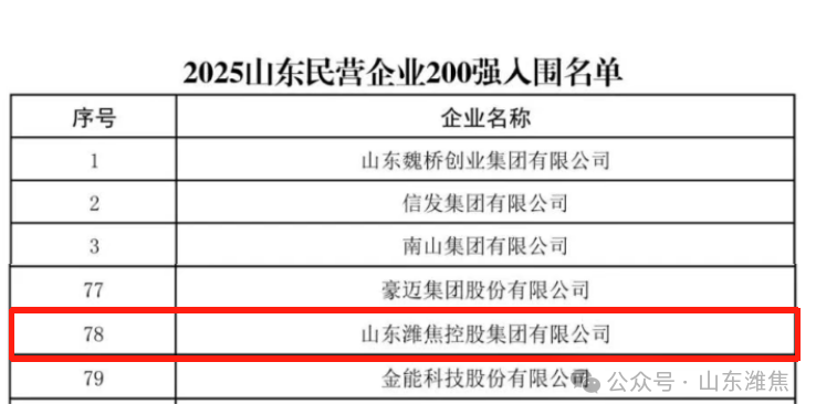 近日,山東省工商聯、省發展改革委、省科技廳、省人力資源社會保障廳、省農業農村廳、省商務廳、省稅務局、省市場監管局、省總商會共同組織開展了2025山東民營企業百強系列榜單發布活動。山東濰焦控股集團有限公司榮登“2025山東民營企業200強”第78位。